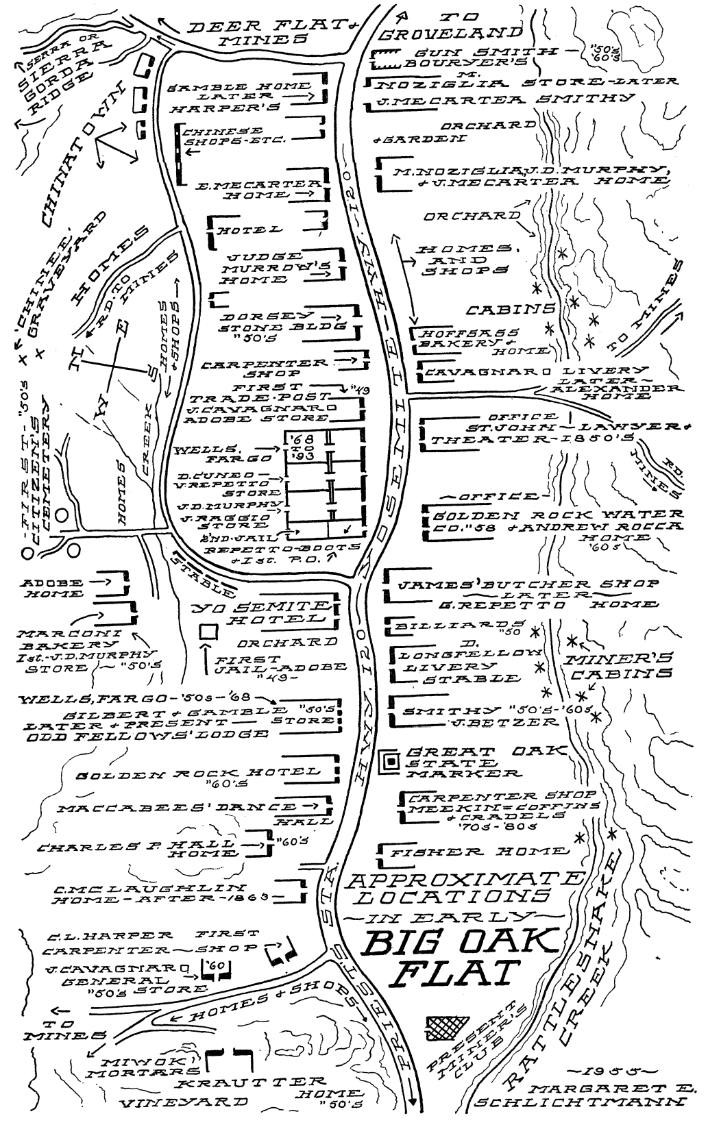They have told us of the big oak—early symbol of the community. Accounts of its size vary. Those who paced around the spreading roots gave sixteen feet as its diameter. Elbridge Locke of Knight’s Ferry, who was given to understatement, tallied eleven feet, one inch in his diary.