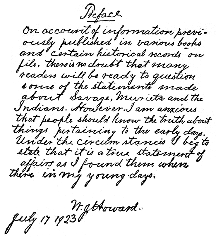On account of information previously published in various books and contain historical records on file, there is no doubt that many readers will be ready to question some of the statements made about Savage, Murieta and the Indians. However, I am anxious that people should know the truth about things pertaining to the early days. Under the circumstances I beg to state that it is a true statement of affairs as I found them when there in my young days.