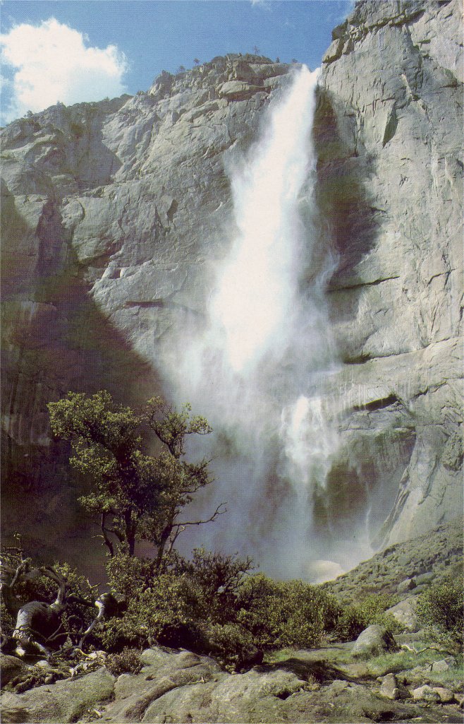 Most famous of all Yosemite’s waterfalls is the one which carries the name of the Park itself —Yosemite Falls. Correctly referred to as “Falls,” it consists of three increments—the 1430 foot sheer drop of the Upper Fall, the 675 foot descent through the tortuous, twisting Inner Gorge and the 320 foot plunge over the Lower Fall. This total of 2,425 feet from rim to Valley Floor makes it the second highest known waterfall on earth. Only Angell Fall in Venezuela is known to be higher—about 3,200 vertical feet in total height. The Lower Fall, seen in this photo, is easily approached by a short trail near Yosemite Lodge. At peak volume—in May—the scene is a wild blending of white water, dark rock, driving mist and the all-pervading roar and clamor of the furious stream. At the time of the full moon in May, when the waterfall fills this grotto with mist, an ethereally beautiful lunar rainbow spans the chasm for three or four nights.