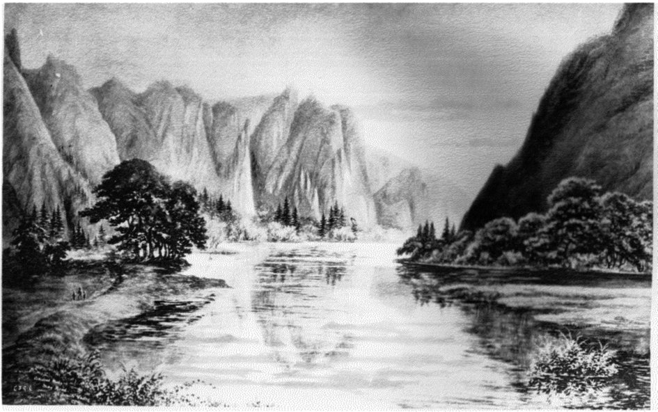 We had now reached the Little Yō-semité, which lies 2000 feet above the Great Valley. It is a mountain-meadow, about a mile in depth, by four in length, enclosed by mighty rock-walls 3000 feet in height. Through these peaceful green pastures glide the still waters of the Upper Merced, clear as crystal.