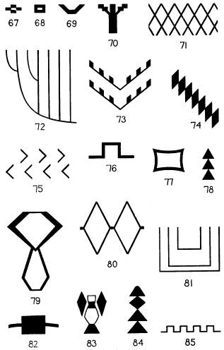 [click to enlarge] Figs. 67-85.—Basketry designs. |