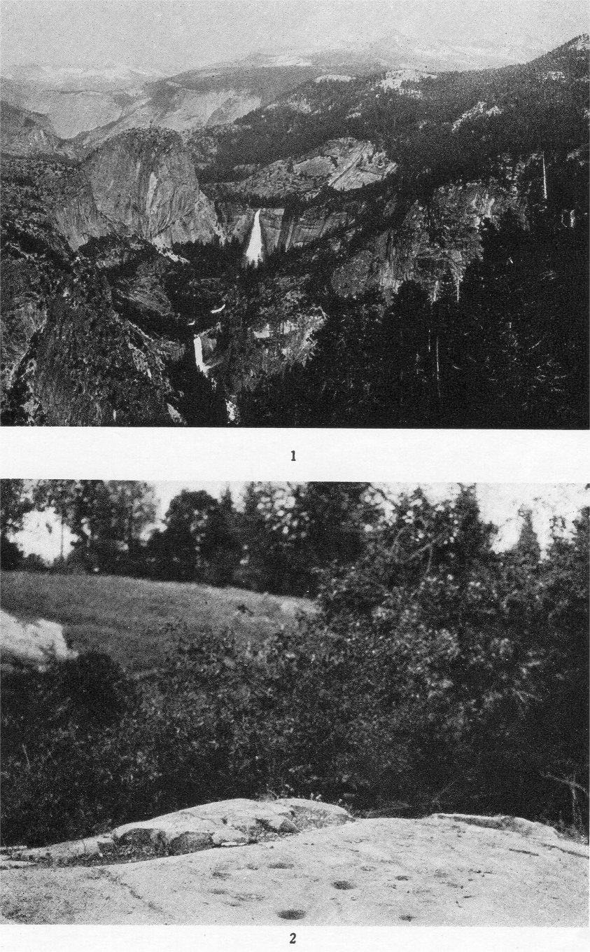 Figure 1. The higher Sierra Nevada region, visited only in summer by the Miwok. Vernal and Nevada falls with the snowclad summits of the high Sierra in the background. Yosemite Valley lies immediately adjacent, to the left. M.P.M. Neg. No. 406395.