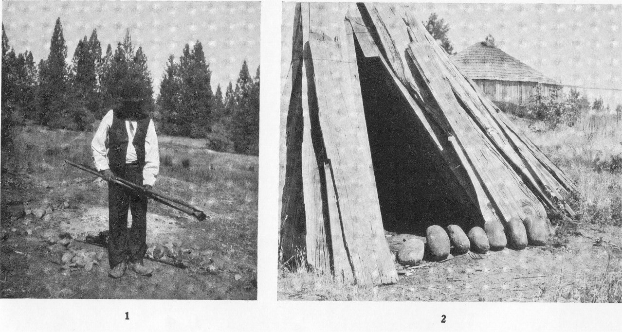 Figure 1. Handling hot cooking stones with the wooden tongs, Northern Miwok, Railroad Flat, Calaveras County. Neg. No. 2739.