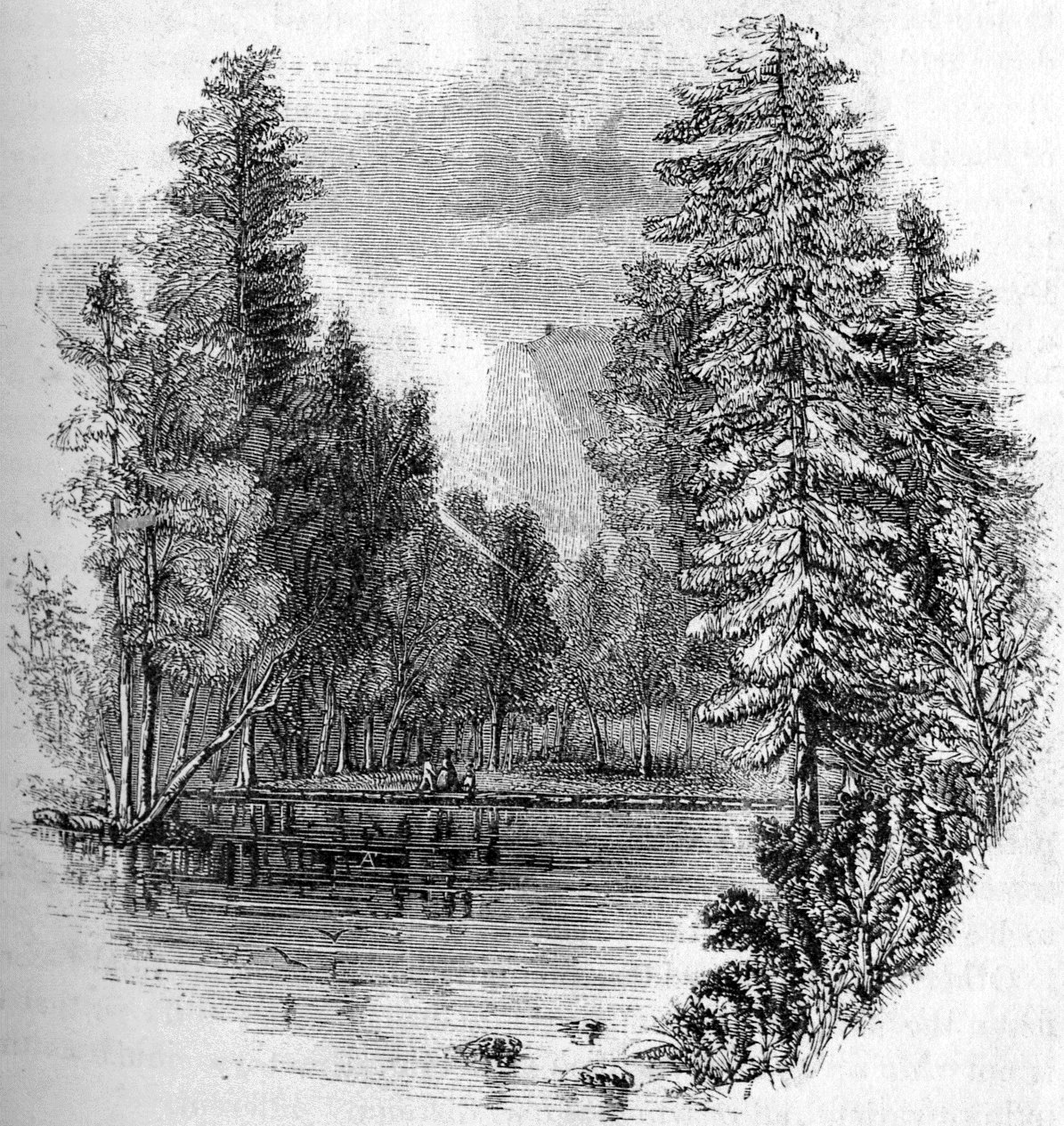 On reaching the top, near the edge of the fall, we find the rock very smooth and bare for many rods, with here and there a stunted tree, living on a short allowance of soil in a narrow crevice. At the back of this bare rock is a limited forest of pines and firs. Huge boulders and masses of granite lie scattered here and there. The river, for some distance above, forces a series of rapids. As a tree has lodged across the stream about a quarter of a mile from the fall, and the smooth rock to the eastward forms another barrier to our progress in that direction, let us cross to the opposite side of the river, and work our way up to that which is now called “the Little Yo-Semite Valley.”