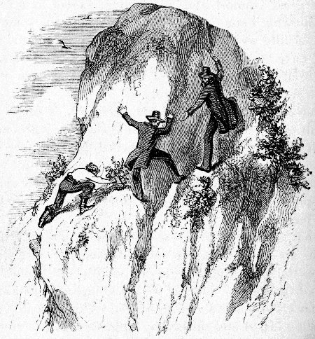 This accomplished we soon begin the ascent of the mountain over loose fragments of debris, and among huge masses of fallen rocks, lying at the side of the mountain, and in the bed of a small but very deep cañon; but these are soon left behind, and we have to commerce climbing around and over points of rocks, walking on narrow edges, or feeling our way past some projecting point, or tree, or shrub; steadying ourselves by a twig, or crevice, or