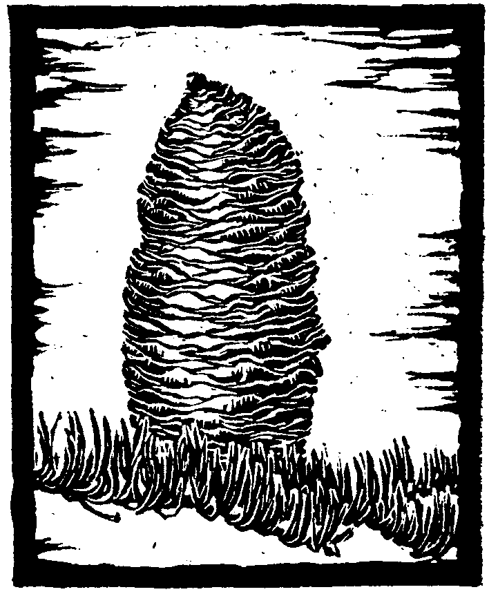 The common name of the White Fir is derived from the ashen hue that weathers upon the rather dark and heavily fissured bark of the old trees. These old trees have a rugged and defiant air which contrasts strongly with the airy grace of their youth.